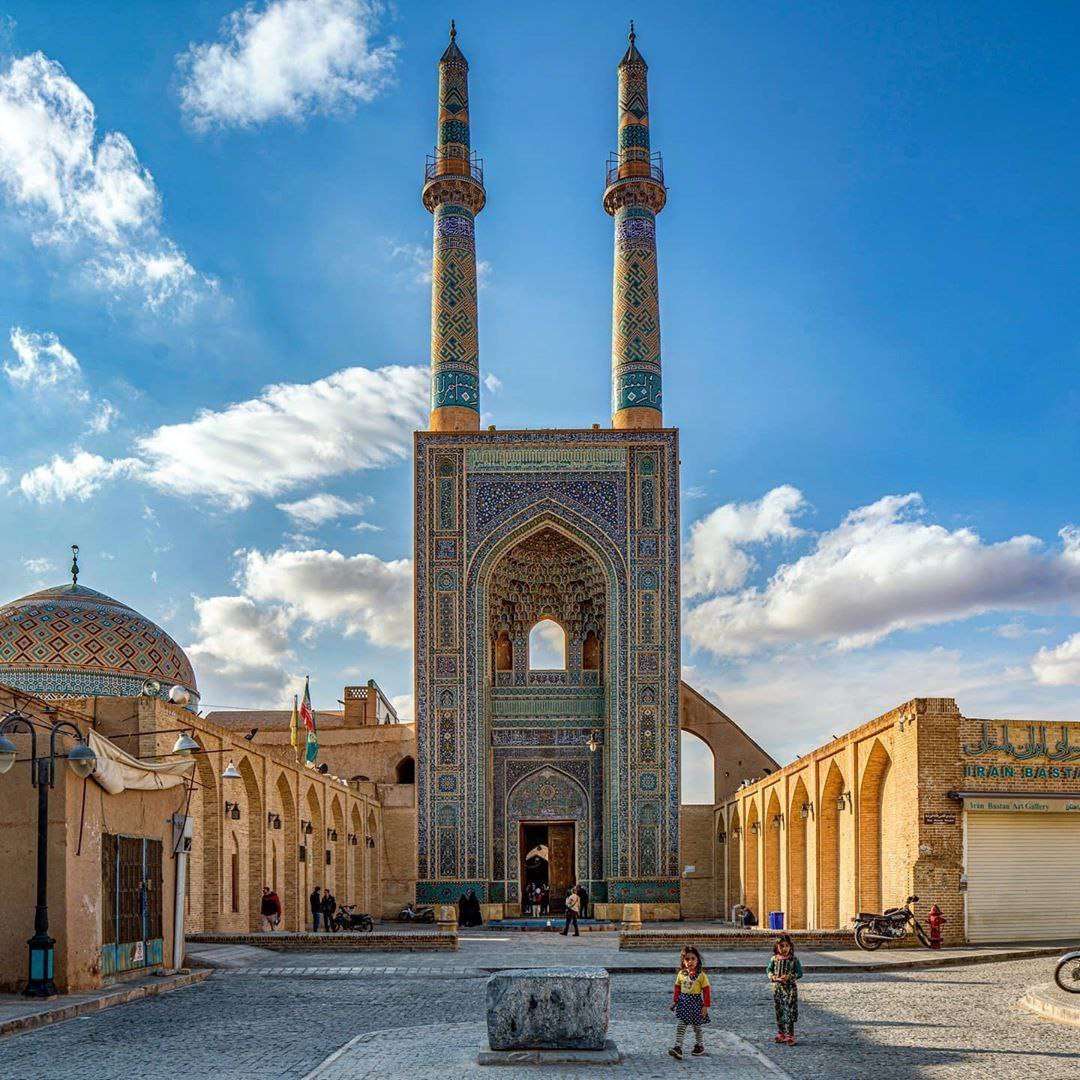 مسجد جامع یزد به شیوه یک ایوان در دل کویر میباشد و در طی حدود ۱۰۰ سال و سه دوره بنا شدهاست. پایههای اصلی مسجد در زمان ساسانیان بر روی یک آتشکده گذاشته است ولی بعد از اسلام در دوره ایلخانی و تیموری بصورت مسجد تکمیل شده است. بنای گنبد خانه متعلق به دوره ایلخانی و سر در رفیع مسجد را متعلق به زمان شاهرخ و دوره تیموری دانستهاند. این بنا از لحاظ خوابیدگی گنبد، سردر رفیع و بلند و همچنین کاشیکاری زیبا و منحصربهفرد، شهرت دارد.ساخت و تکمیل مسجد جامع یزد در طول یک قرن و در دورانهای مختلف تاریخی انجام شده است که از مهمترین آنها میتوان به سلطنت ایلخانی، صفویان، حکومت تیموریان، فرمانروایی آل مظفر و قاجاریان اشاره کرد. در واقع هر قسمت از این بنای تاریخی به مرور زمان و توسط بانیان متعددی ساخت و مرمت شده است.