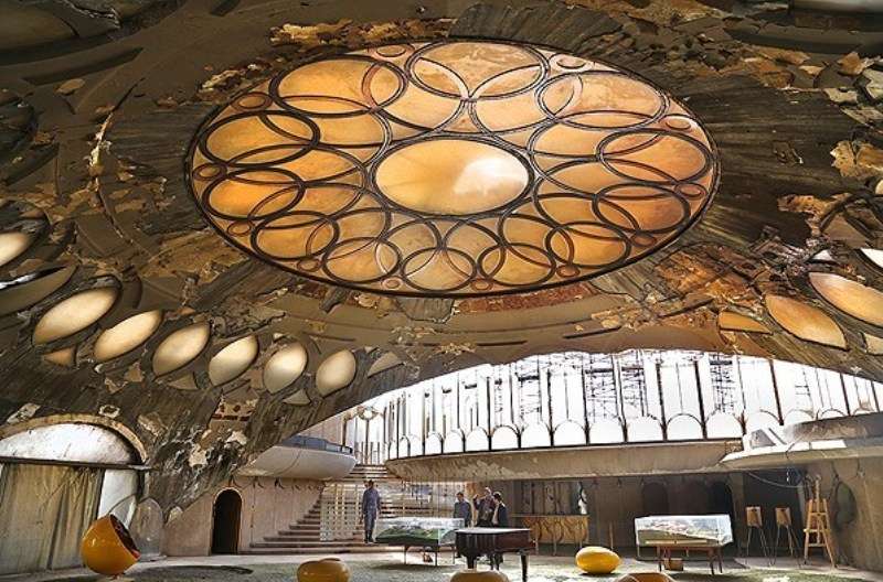 سازه اصلی بنا به صورت سفره ماهی طراحی شده است و ضلع شمالی کاخ و محوطه بیرونی دریاچه نیز به‌ شکل باله‌های سفره‌ماهی اجرا شده‌ است. در طراحی فضای بیرونی دریاچه کوچکی از سه طرف کاخ را احاطه کرده است. همه فضاهای معماری در زیر سقفی با فرم حلزونی و با نورگیرهای گوناگون و به‌شکل دانه‌های مروارید اجرا شده‌ است. تالار طلایی بار، دفتر مخصوص شمس، تالار پذیرایی، سالن سینما، سالن بیلیارد، استخر، آب‌نما، محل نگهداری پرندگان کمیاب، اتاق‌های خواب از بخش‌های متنوع این کاخ هستند. یکی از مهم‌ترین بخش‌های این کاخ اتاق صدف است که دارای تزئینات مختلفی بوده، به خصوص نمای بیرونی آن که بصورت حلزونی شکل ساخته شده‌ است.