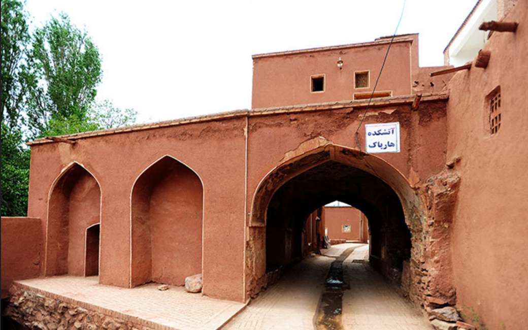 قدیمیترین اثر تاریخی ابیانه آتشکدهای است که مانند دیگر بناهای دِه در سراشیبی قرار گرفته است. آتشکده ابیانه را نمونهای از معابد زردشتی دانستهاند، که در جوامع کوهستانی ساخته میشد. روستای ابیانه دارای دو زیارتگاه است: یکی مرقد شاهزاده عیسی و شاهزاده یحیی در جنوب روستا که به گفته اهالی فرزندان امام موسی کاظم بودهاند و زیارتگاه دیگر ابیانه هینزا نامیده میشود و از جمله این آتشکدهها، آتشکده هارپاک است .آتشکده هارپاک در سابات یکی از گذرگاههای سرپوشیده قرار دارد. آتشکده هارپاک در زمان هخامنشیان ساخته شد و در زمان ساسانیان به اوج خود رسید. این بنا دارای سه طبقه و چهار طاقی است و از مصالح به کار رفته در آن سنگ لاشه و گچ هستند. این بنا از هر طرف قابل رویت است. در مسیر کوچه اصلی ابیانه که از دروازه بالا تا دروازه پایین امتداد دارد چهار تا از گذرگاههای سرپوشیده که سبات (سابات) نامیده میشوند و اولین آنها سباتی است که آتشکده در آن قرار دارد. این بنا در ۳ طبقه ساخته شده که دارای چهار طاقی است و از سنگ لاشه و گچ ساخته شده است.