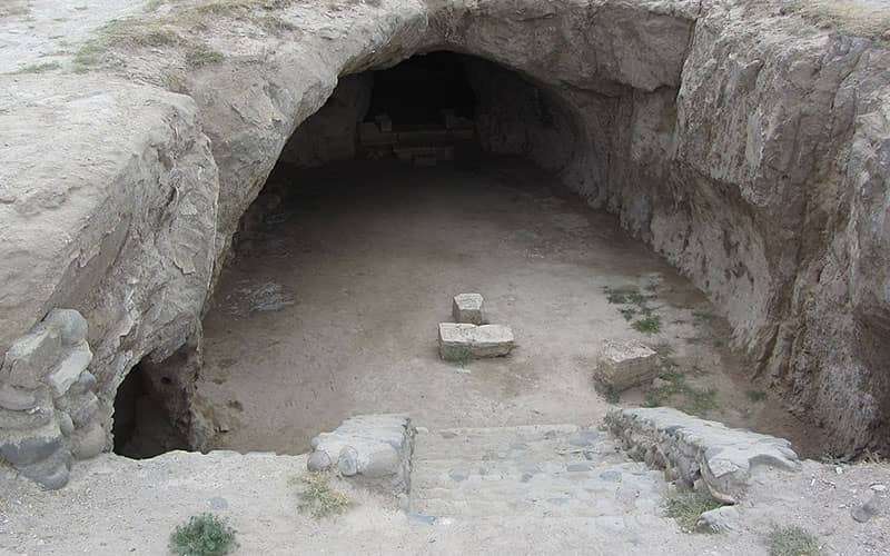 این بنای تاریخی مکانی برای برگزاری آیین پرستش مهر (میترا) و متعلق به آیین مهرپرستی بوده است. اهالی منطقه این محوطه را با نامهایی مانند «امامزاده معصوم مراغهای»، «اجاق» و «اولیا» میشناسند و قسمتهایی مانند «معبد»، «قبرستان»، «اصطبل» و «چله خانه» دارد که بهنظر میرسد قبرستانی مربوط به عصر آهن باشد. این معبد در زیر گورستانی تاریخی قرار دارد و با خاکبرداری، بخشهایی از آن خود را نمایان کرد و همچنان بخش عمدهای از معبد در زیر خاک مدفون است.