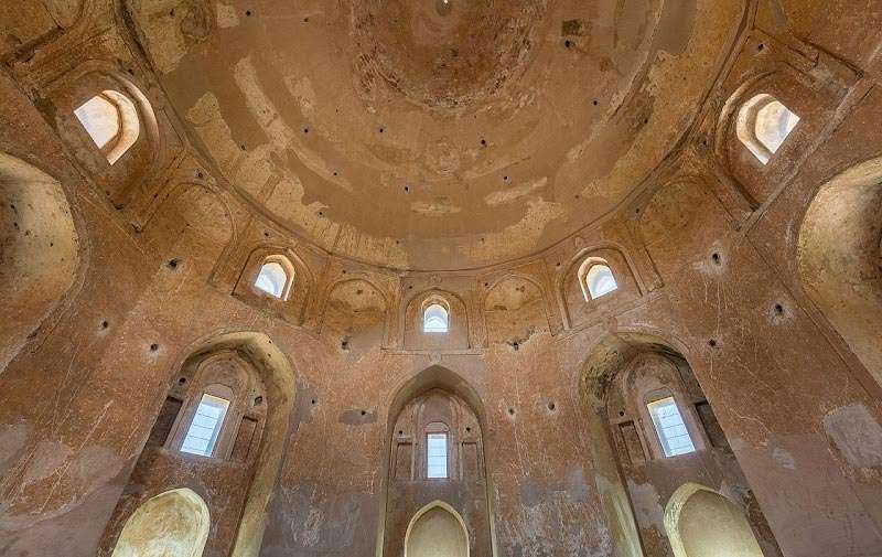 گنبد را با استفاده از آجر ساختهاند. ارتفاع ساقه سنگی گنبد هشت متر است و در وسط آن نورگیری تعبیه کردهاند. بهنظر میرسد قرار بوده است این گنبد دوپوش باشد و به دو دلیل این اتفاق نیفتاده است؛ یا یکی از پوشها از بین رفته یا عملیات ساخت پوش دوم ناتمام مانده است. داخل گنبد نیز ظاهرا تزیینات گچبری داشته که قسمت بالای آن ریخته است. قسمت پایین بنا نیز اگر تزییناتی داشته، از بین رفته است.